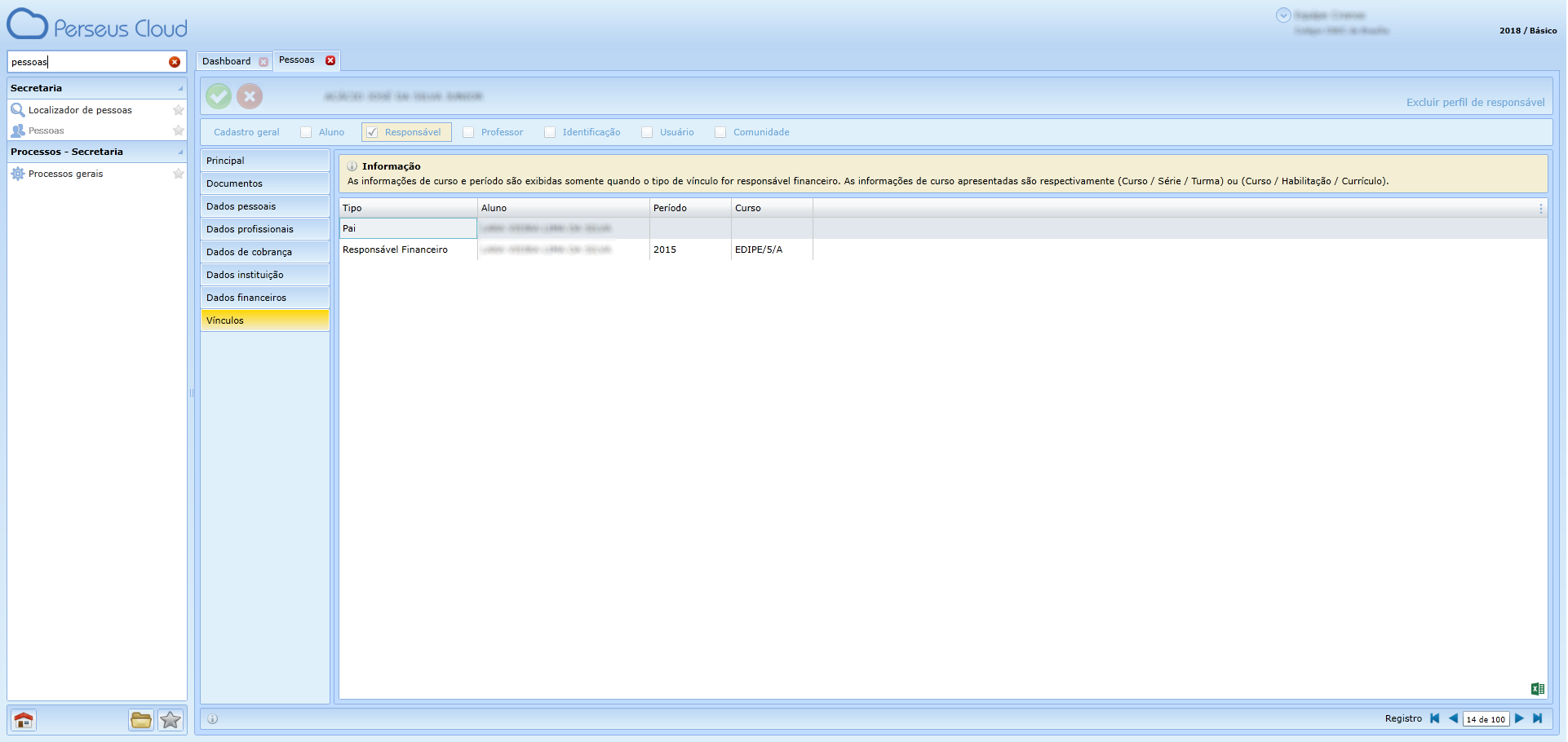 – Período: Só existirá para o tipo Responsável Financeiro. Representa o período no qual a pessoa foi responsável financeiro de um (a) determinado (a) aluno (a);