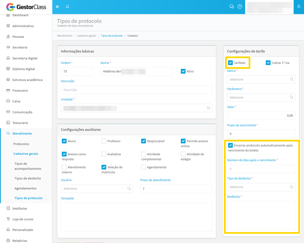 Criada configuração para encerrar automaticamente um protocolo tarifado após o vencimento do boleto, quando marcado ‘Tarifado’ irá apresentar a opção ‘Encerrar protocolo automaticamente após vencimento do boleto’, se marcada irão abrir as configurações conforme imagem.